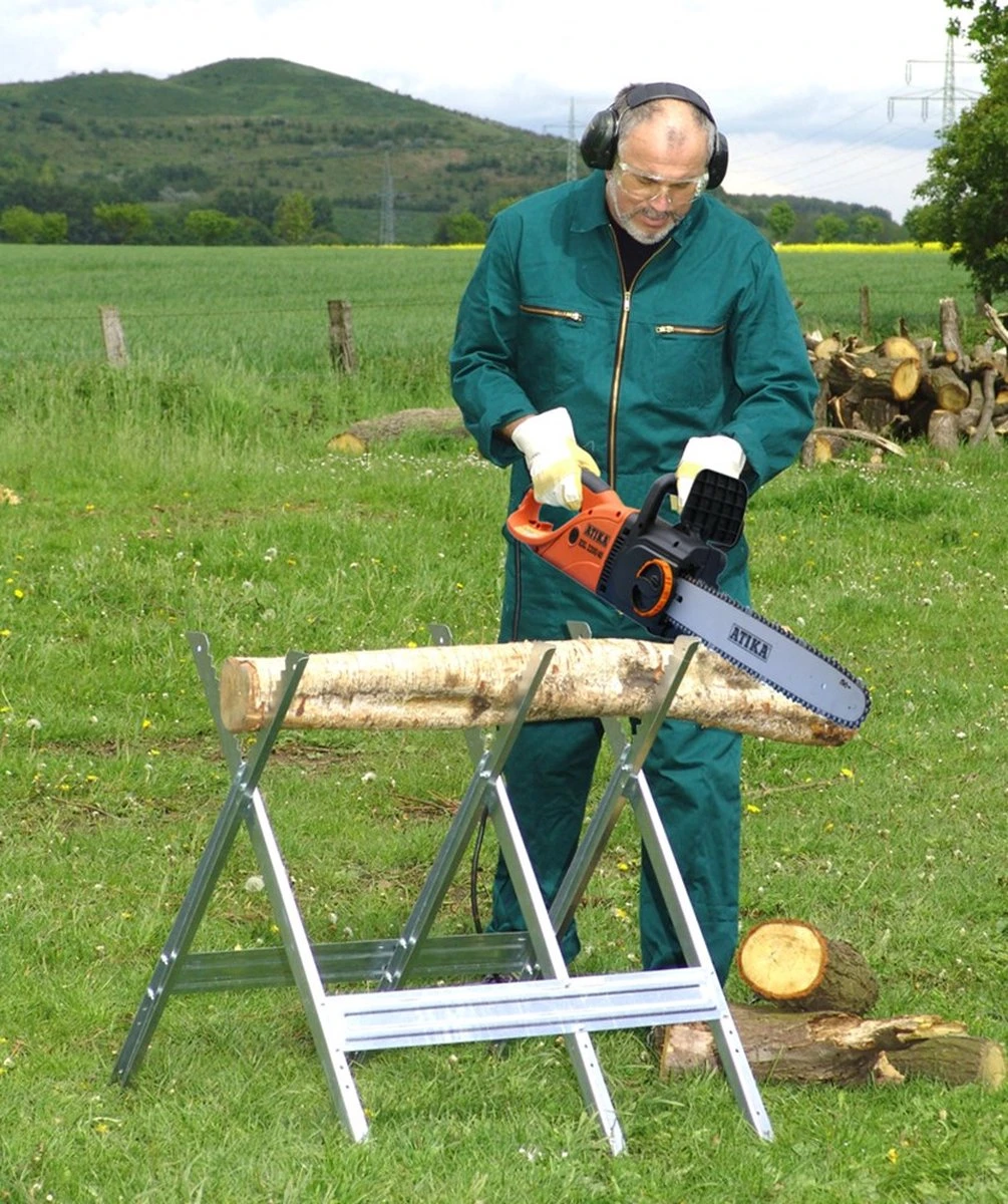 Robuuste aluminium zaagbok van Atika. Veilig werken dankzij de sterk geprononceerde tanden die voorkomen dat het hout gaat draaien. Ideaal voor het zagen met een kettingzaag.