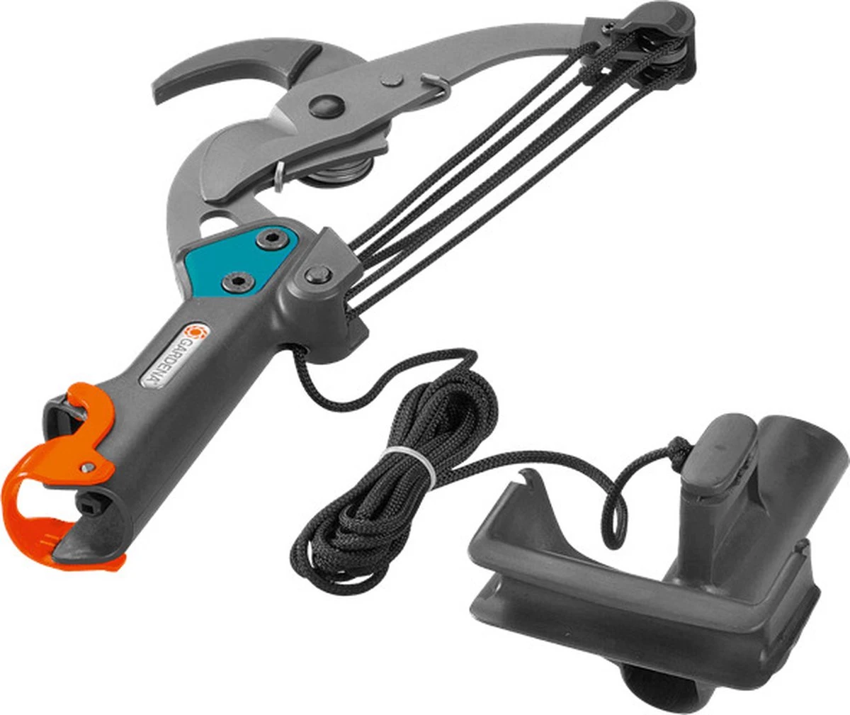 Gardena Combi-System-aambeeldboomschaar met 3-voudige katrolwerking. Enorme krachtbesparing door 3-voudige katrolwerking en dubbele hefboomwerking. Knipt makkelijk takken af door de grote knipopening. Geharde messen voorzien van een antikleefcoating voor een zuivere, exacte snit. Door takophanging, lichte inspanning bij het vasthouden van de schaar daardoor kunt u gemakkelijk aan het koord trekken. Aanzienlijke krachtbesparing door 5-voudige transmissie (60% meer kracht).