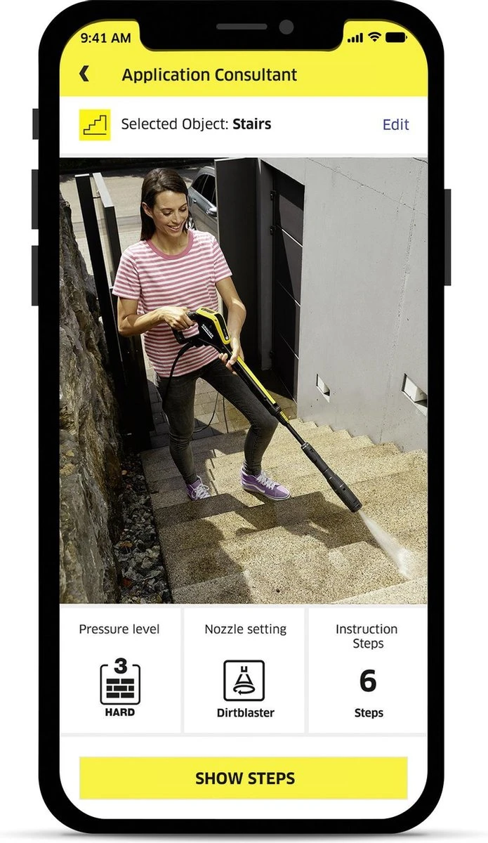 - Met de Kärcher Home & Garden-app word je een schoonmaakexpert. Profiteer van al onze Kärcher-expertise om perfecte reinigingsresultaten te bereiken. De app brengt via bluetooth de optimale druk over naar de hogedrukreiniger.