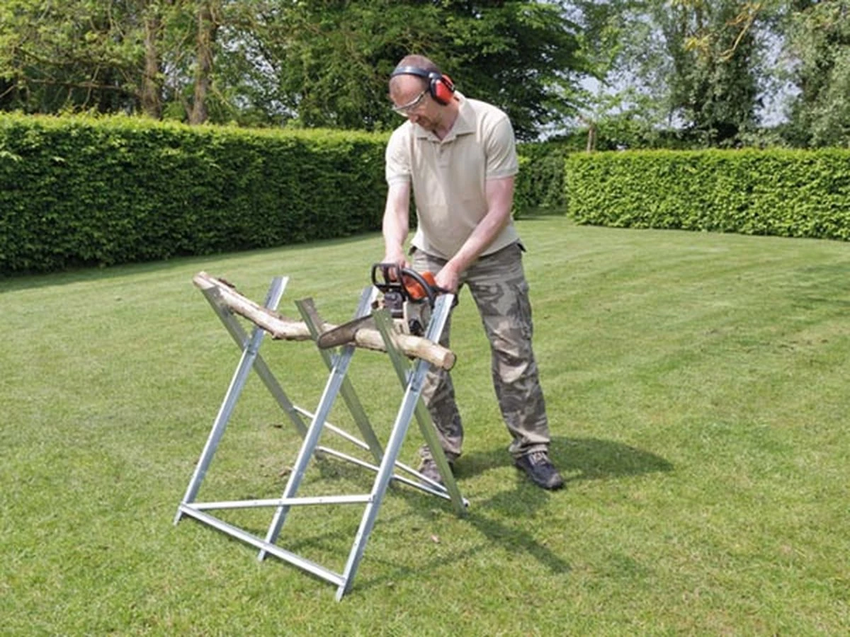 Zeer duurzame gegalvaniseerde zaagbok met vertanding om het hout stevig vast te houden tijdens het zagen. Een onmisbaar hulpmiddel om snel en vooral veilig je brandhout tot Ø 25 cm te verwerken met de kettingzaag.